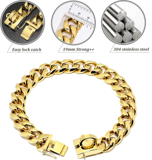 Gold Dog Chain Collar,Metal Choke 19Mm Collar with Design Secure Buckle, Stainless Steel 18K Cuban Link for Small Medium Large Dogs Walking Training,19"