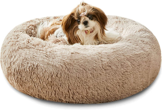 Faux Fur Donut Cuddler Pet Bed - Calming Anti-Anxiety Bed - Washable Round Bed (20", Brown)